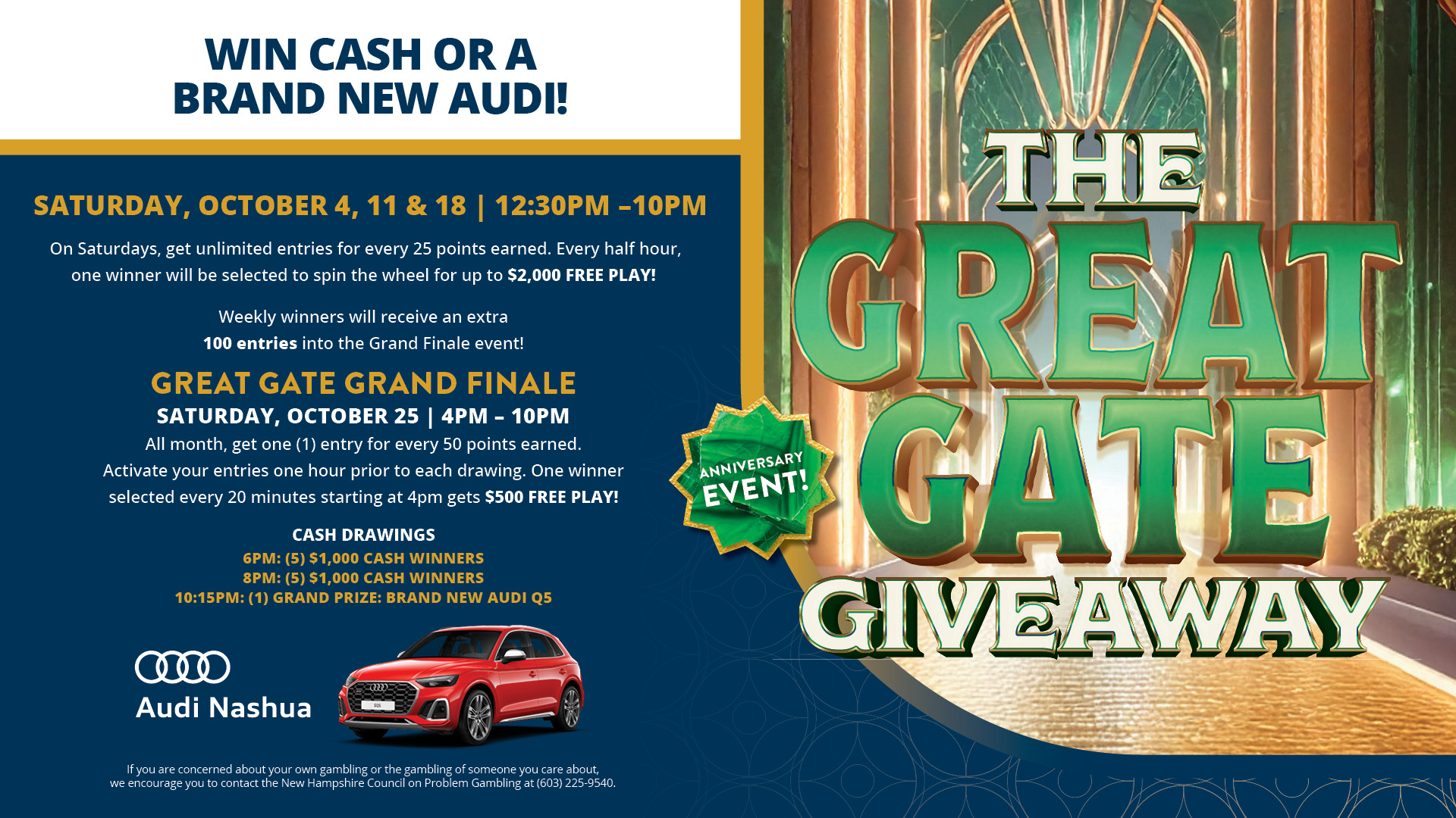 Neal will be broadcasting LIVE at the Gate City Casino from 4-6pm to get things going.  Starting at 4pm, every twenty minutes someone will win five hundred dollars in FREE PLAY!  Then at both 6 and 8pm, five people will win one-thousand-dollars cash!  At 10:15pm, one lucky person wins the grand prize: a brand-new Audi Q5! You MUST be present to win!  See you Saturday for the Great Gate Giveaway at Gate City Casino in Nashua.